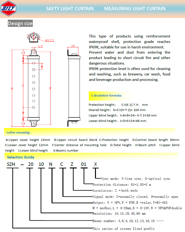 The SZH series of waterproof and safety light curtains are designed with a sturdy and clean shape to ensure that the product meets the functional requirements. The SZH series waterproof safety light curtain is specially designed for operation protection applications. It can be started immediately after power-on, without a lot of configuration work, and its detection range can be precisely adjusted according to the application needs. In addition, the safety light curtain has the following features: