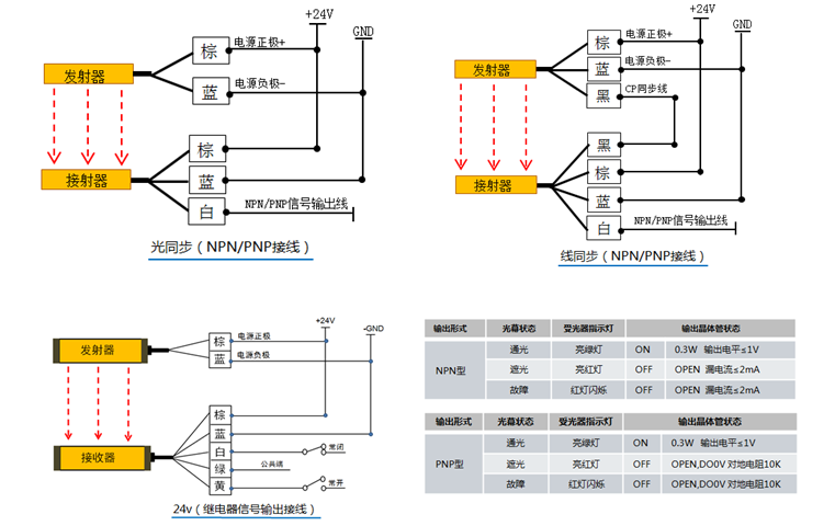 4.信號(hào)輸出:這個(gè)就比較簡(jiǎn)單了,安全光柵作為安全防護(hù)類產(chǎn)品,當(dāng)安全光柵感應(yīng)到物體遮光后,有信號(hào)輸出的,這個(gè)一般都要跟電子工程師溝通,確認(rèn)接到哪里是PLC,還是繼電器,還是232 /485接口,是用NPN(常閉/常開),還是用PNP(常閉/常開)等,都是要確定的。