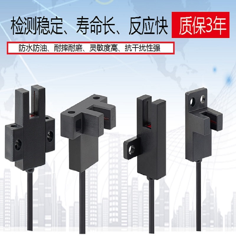 槽型光電開關(guān)凹槽寬度決定了感應(yīng) 接收信號(hào)的強(qiáng)弱和接收信號(hào)的距離但當(dāng)被檢測(cè)物體從槽中通過時(shí),光被遮擋,光電開關(guān)便動(dòng)作,輸出一個(gè)開關(guān)控制信號(hào),切斷或接通負(fù)載電流,從而完成一次控制動(dòng)作。 以光為媒介,由發(fā)光體與受光體間的紅外光接收和轉(zhuǎn)換,以檢測(cè)物體的位置。槽型光電開關(guān)在接近開關(guān)中也是非接觸型的。它受檢測(cè)體的制約較少,檢測(cè)距離長(zhǎng)。發(fā)送器對(duì)準(zhǔn)目標(biāo)發(fā)射光束,發(fā)射的光束一般來源于半導(dǎo)體光源,發(fā)光二極管(LED)、激光二極管及紅外發(fā)射二極管。光束不間斷地發(fā)射,或者改變脈沖寬度。接收器有光電二極管、光電三極管、光電池組成。在接收器的前面,裝有光學(xué)元件如透鏡和光圈等。在其后面是檢測(cè)電路,它能濾出有效信號(hào)和應(yīng)用該信號(hào)。