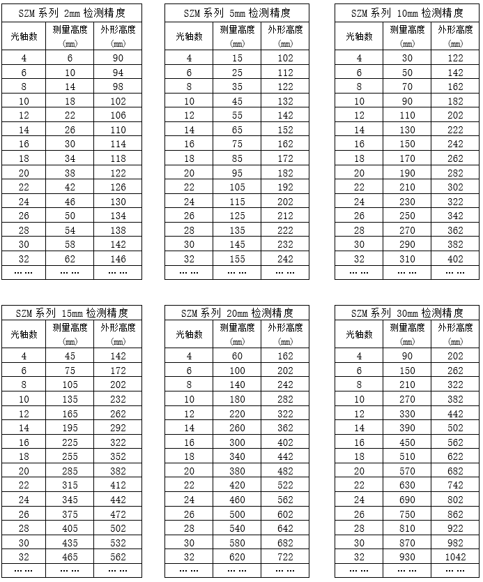 ■ 高分辨率光幕:1,2,2.5,5,7.5,10,15,20,30,40,60mm 精度,多達11種選擇。