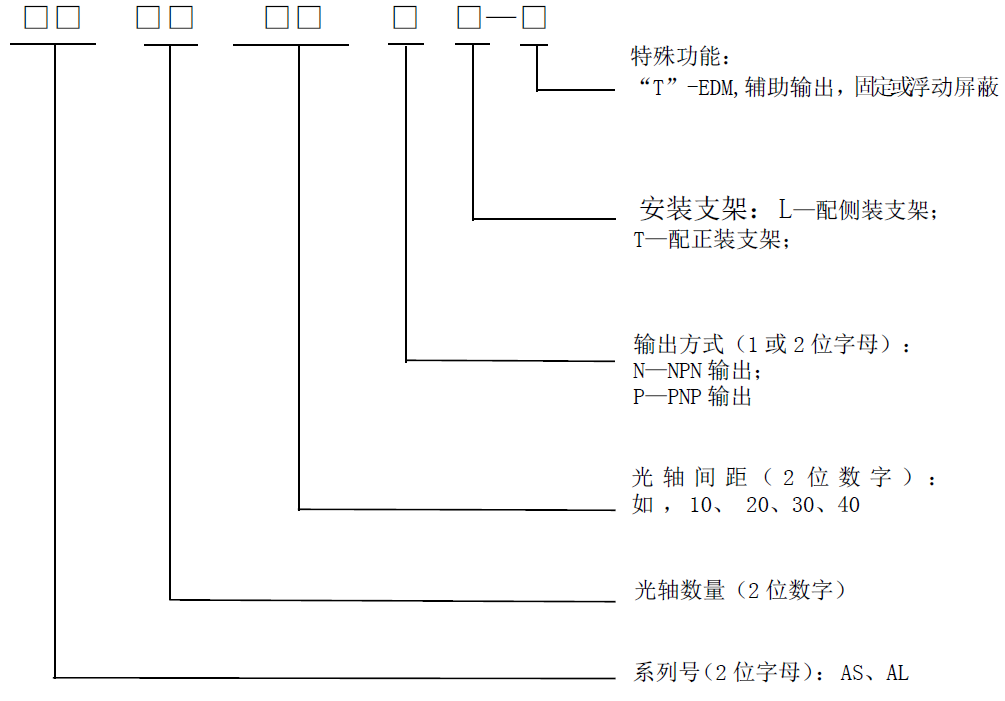 安全光幕的規(guī)格由六部分組成,第三、第四、第五、第六部分以“—”分開。第一部分表示光幕裝置,第二部分表示檢測精度,第三部分表示保護(hù)高度,第四部分為輸出方式,第五部分為安裝支架,第六部分表示特殊功能。例如:AS1610PE-T,光軸數(shù)量16 個,光軸間距10mm,雙路PNP 輸出,上下正裝支架。